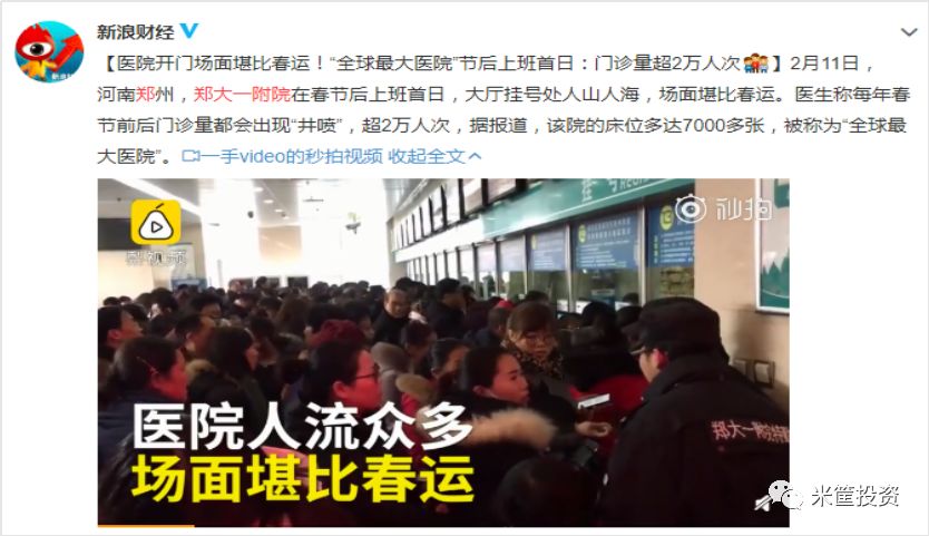 据报道:今年春节后首日,亚洲最大医院郑大一附院门诊量出现“井喷”,超20000人次,场面堪比春运。