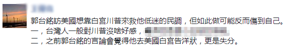 此外,郭台铭将见特朗普的消息传到岛内后,有台湾网友进行了评论。有人认为,如果郭赴美是想靠白宫来拯救民调,那此举可能会伤到自己↓