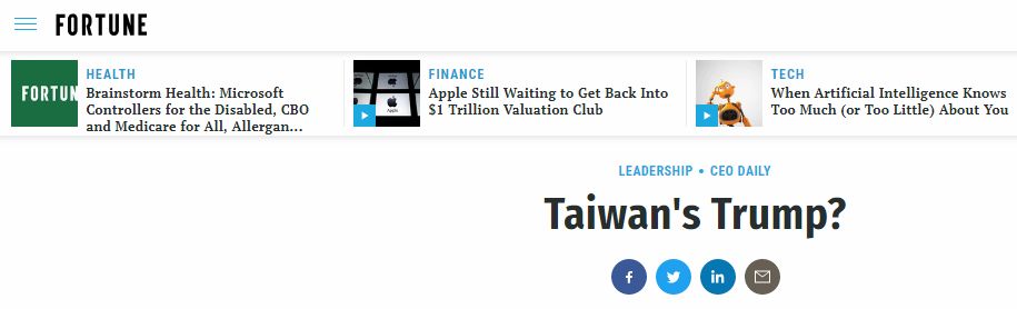 由于郭台铭和特朗普都具有企业家身份,郭参选2020后,岛内出现“台版特朗普”的说法,美国《财富》杂志甚至还曾以《台湾特朗普?》(Taiwan’s Trump?)为题发布文章,声称郭台铭有两大难题:一是面对超人气的高雄市长韩国瑜的挑战,二是鸿海在中国大陆有很多工厂。