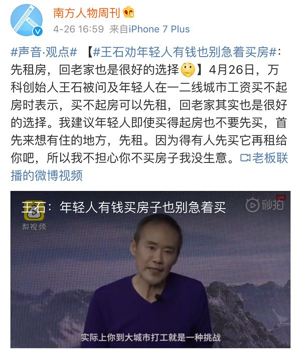 王石如果像法国前总统奥朗德那样,当上总统后还在租房,那么他劝“年轻人可以租房”的建议就让人挑不出毛病。否则,网络上对他就会有“何不食肉糜”、“站着说话不腰痛”的指责。