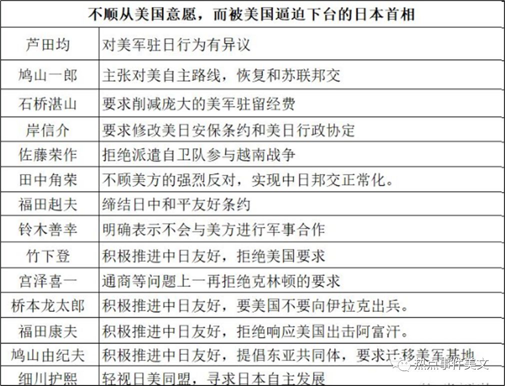 例如,当年田中角荣为了确保日本的石油资源去了中东搞石油外交触犯了美国的利益,并且先于美国和中国建交,结果被美国搞了洛克西勒事件。由他创建的田中派、经世会出身的政治家也大都亲中、亲韩朝,而远美,结果被一个个搞下台。相反,一向亲美的清和会的一干人等同样收了贿赂却从来没有被东京地检特搜部逮捕或调查。