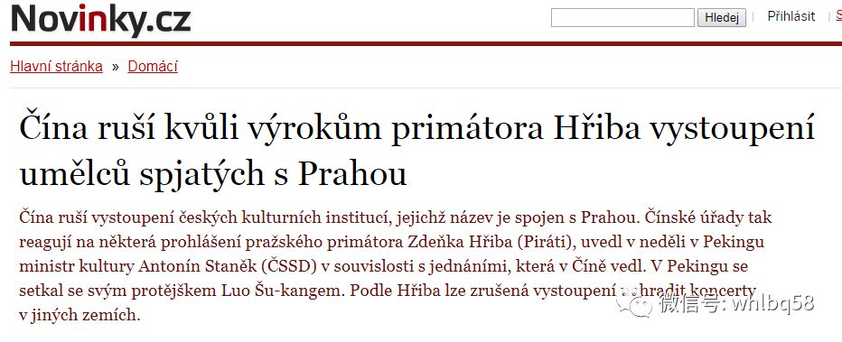这篇报道称,因为捷克首都布拉格市长贺吉普(Zdeněk Hrib)3月份前往台湾与蔡英文会晤并发表了支持台湾当局的言论,所以中国政府相关部门取消了布拉格爱乐乐团原订于今年9、10月份14场在中国的巡回演出。