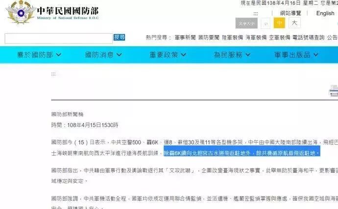 ▲台湾省国防部公布的信息,注意标蓝的部分:除轰-6k继续向北经宫古水道返回驻地外,余共机循原航线返回驻地。