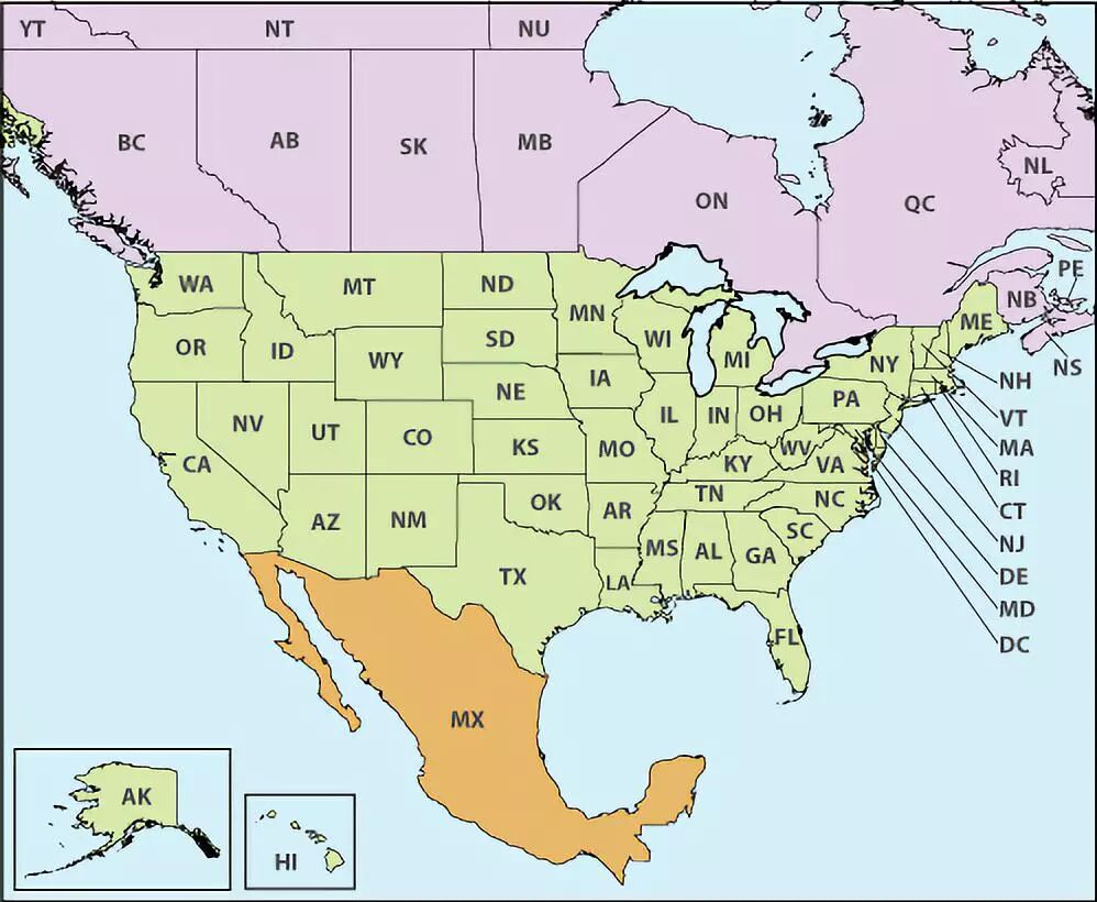 北美地图,绿色为美国、紫色为加拿大,橘黄色为墨西哥。