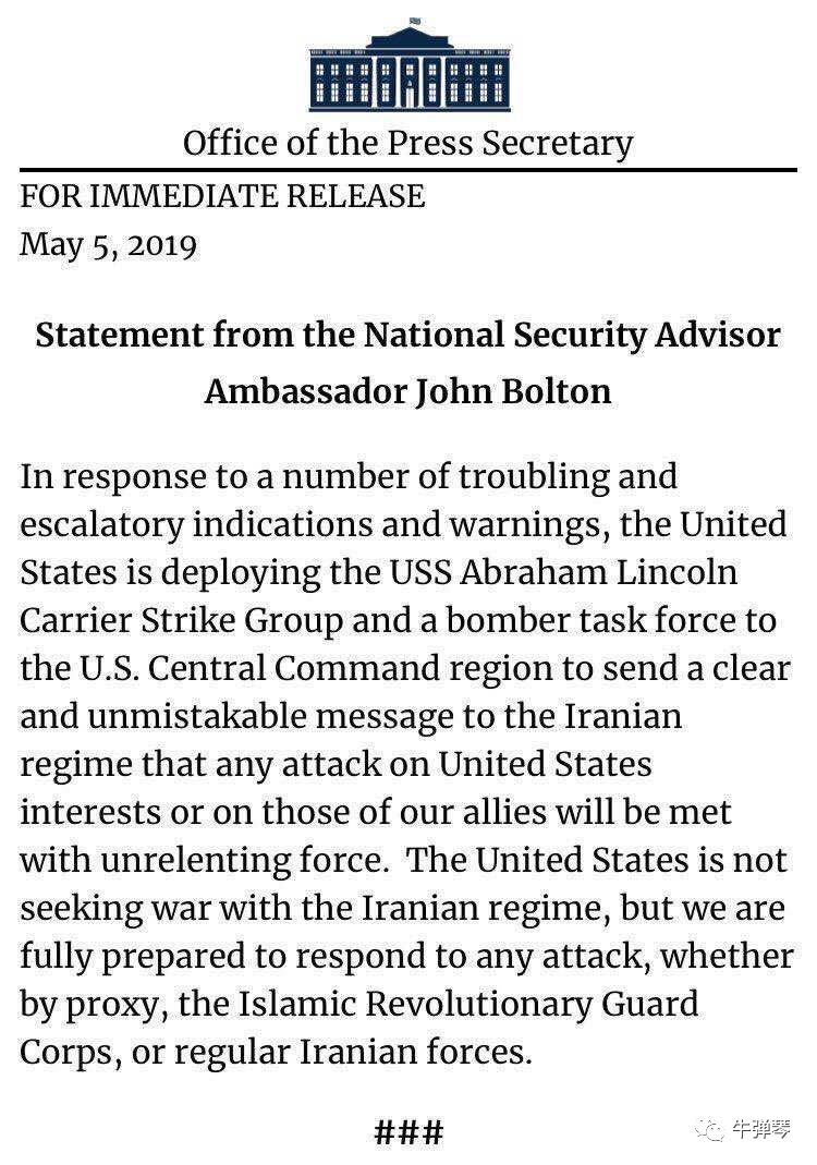声明是美国国家安全顾问博尔顿发布的,大致如下: