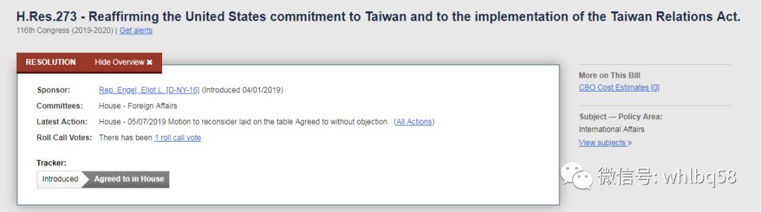 【美众议院通过《重新确认美国对台......》决议案截图】