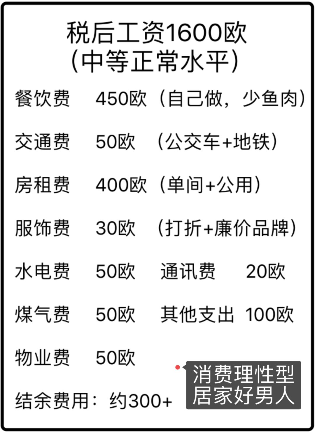 在这一简单的账目罗列中,我们可以看到:在并不追求每顿饭像中国人那样丰盛,几乎没怎么“下馆子”,也不外出游玩,不考虑更换手机或电脑,没有车要保养,没有房产税要交、家中无需人工维修等其他支出的情况下,所剩的已经不多了。
