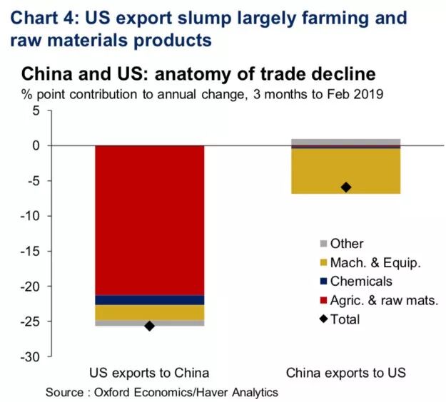 其实,关税的影响已经可以从2019年一季度的数据体现。OE的研究显示,一季度中国从美国的进口同比下降30%,而中国对美国的出口则下降9%。双边贸易降幅达250亿美元,相当于全球贸易量的0.5%。
