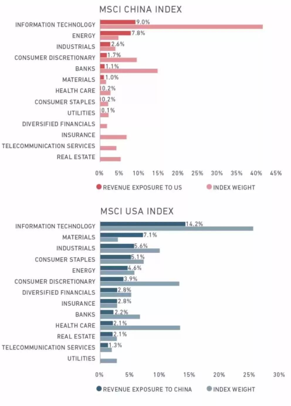 在贸易摩擦持续的背景下,公司营收来源敞口的分析,洞悉公司、行业的本质对投资机构而言则显得愈发重要。MSCI试图用“MSCI经济风险敞口数据方法论”(MSCI Economic Exposure Data Methodology)来评估贸易相关风险以及板块和个股层面的机遇。例如,IT部门在MSCI美国指数和MSCI中国指数中都对中美经济体风险敞口较高。相较之下,这两大指数中的电信服务板块来自中美的收入都较小。