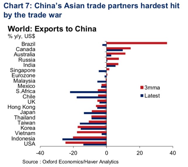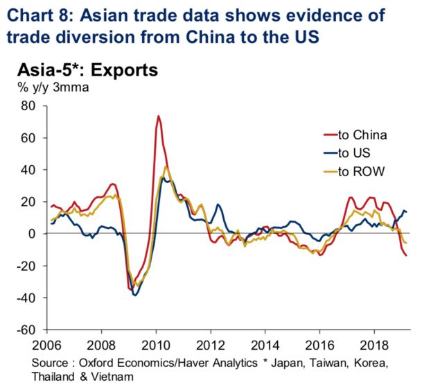 此外,贸易摩擦也对其他国家产生溢出效应,影响最大的则是亚洲,如日本、越南、韩国等经济体,它们对中国的出口量大幅下降10-20%;OE也发现,相较之下,欧洲对中国的出口只是小幅下降,因此其此前也提出,中国进口的下降更多可能是供应量的问题而不是内需疲软(这与2015-2016年不同)。