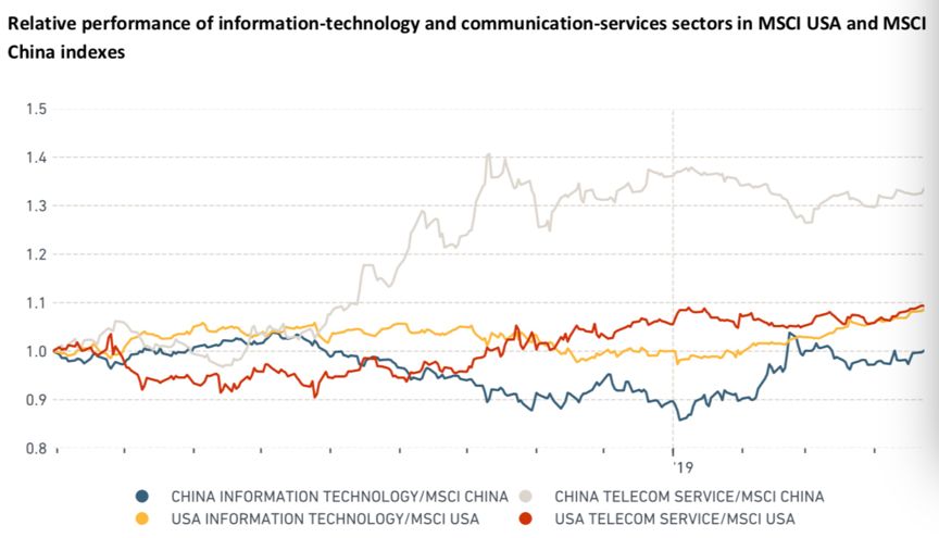 因此,在去年二到四季度,MSCI美国指数和MSCI中国指数的IT板块跑输,而电信服务则跑赢。而当外部风险下降时(2019年初),两大指数的IT板块则逆转了颓势。