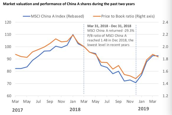 当然,股市估值变化也是投资机构考虑的因素。例如,今年以来,A股大幅攀升,主要是因为市场经历了去年四季度的重挫,相较于全球市场估值偏低。去年A股市场(以MSCI中国A股指数为代表)跌幅达25%,创4年新低,远高于MSCI美国指数。2018年的抛售压缩了A股市值,PB(市净率)创多年新低。