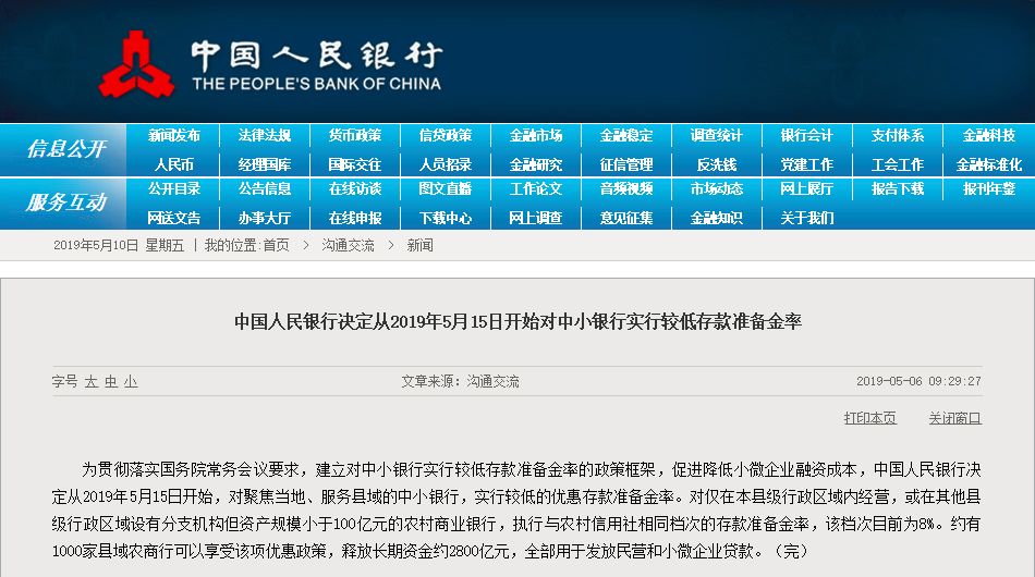中国人民银行决定从2019年5月15日开始对中小银行实行较低存款准备金率。央行在5月6日早上9:29分出台这项政策,意图缓解投资者对突发性外部因素所可能引起市场恐慌。