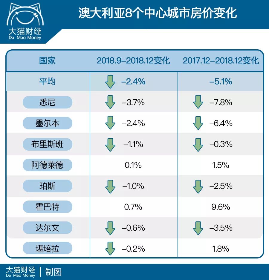 澳大利亚统计局(ABS)的数据显示,澳大利亚八个中心城市的平均房价在2018年跌了5.1%,到2018年第四季度,澳大利亚的国内住宅总价值已经只剩下6.7万亿澳元了。