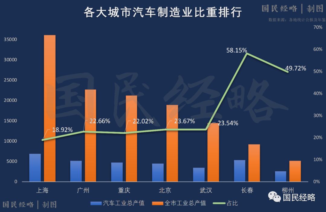 从汽车工业占比来看,长春、柳州占据半壁江山,上海、广州、重庆、北京、武汉都在1/4-1/5左右。