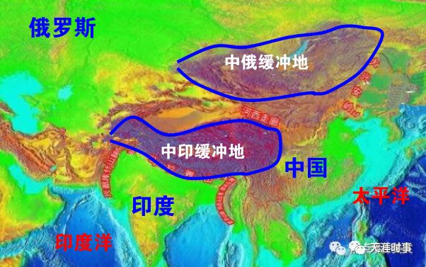 中国位于欧亚大陆东面,与碎化分布的欧洲各国不同,中国版图在东亚居相对主体的地位,中国的政治经济重心与在南亚中居主体地位的印度和在北亚居主体地位的俄罗斯之间存在着巨大的战略缓冲地带,这使三国不形成绝对的冲突:印度的发展重心在印度洋,中国的发展重心在西太平洋,而俄罗斯的发展重心在欧洲部分。