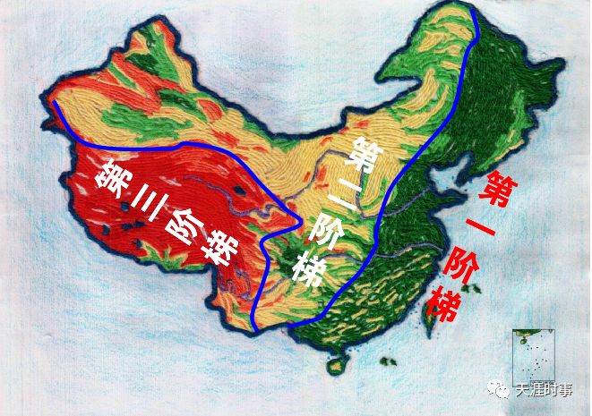 中国气候最好、最肥沃的土地在于东部沿海地区,向西高山耸立、向北气候恶劣,我们可以把中国版图大致呈三个阶梯:第一阶梯是东部平原地带,平均海拔在500米左右;第二阶梯为中部区域,平均海拔在1000-2000米左右;第三阶梯是西部地区,平均海拔在5000米以上。