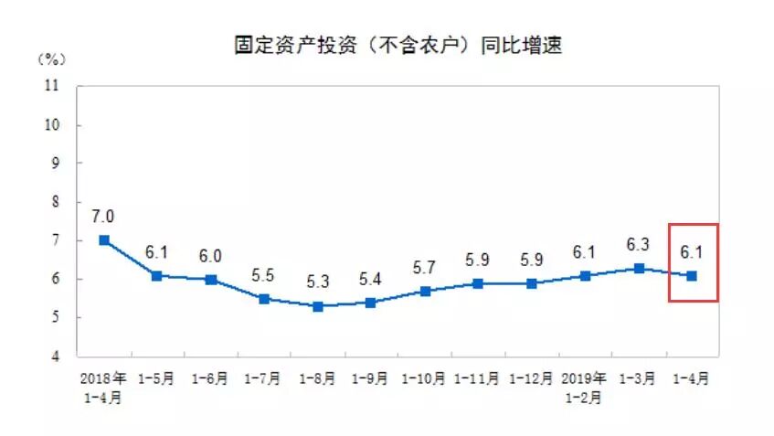 上图是“固定资产投资”增速,同比增速从上个月的6.3%回落到了6.1%。可见,央行在4月的“轻踩刹车”产生了立竿见影的效果。中国是投资拉动型经济,投资增速长期低于GDP增速,会带来持续的稳增长压力。
