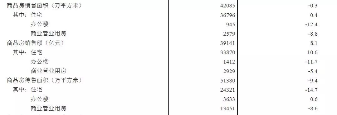 上图是“2019年1—4月份全国房地产开发和销售情况”的局部截屏。可以看出,今年1到4月“商业营业用房”销售了2579万平方米,同比下降了8.8%。