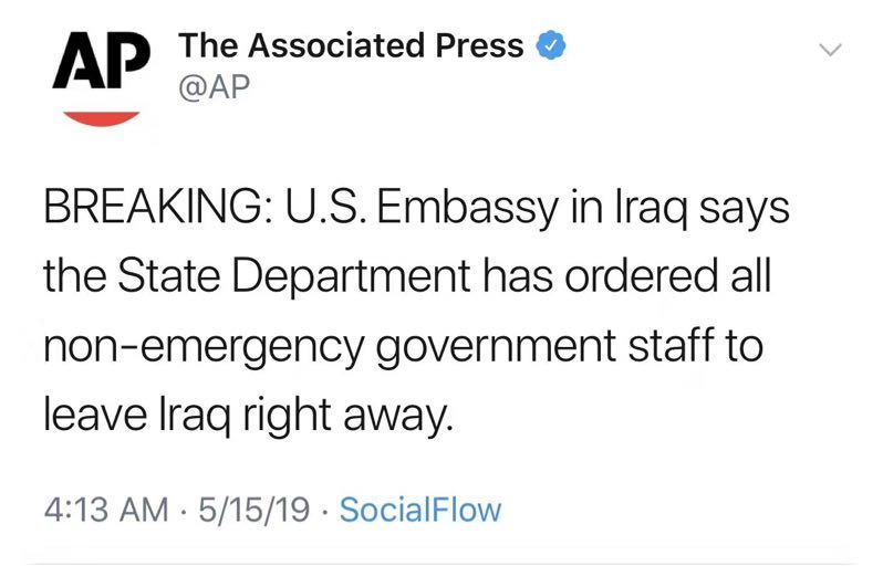 随着美国和伊朗紧张关系的升级,今天下午4时许,美联社发布消息,美国要求驻伊拉克大使馆所有非紧急政府人员立即撤离。