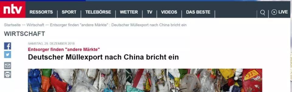 德国ntv电视台今年1月报道称,在中国严格的垃圾进口规定生效一年后,德国垃圾出口行业已经崩溃了。