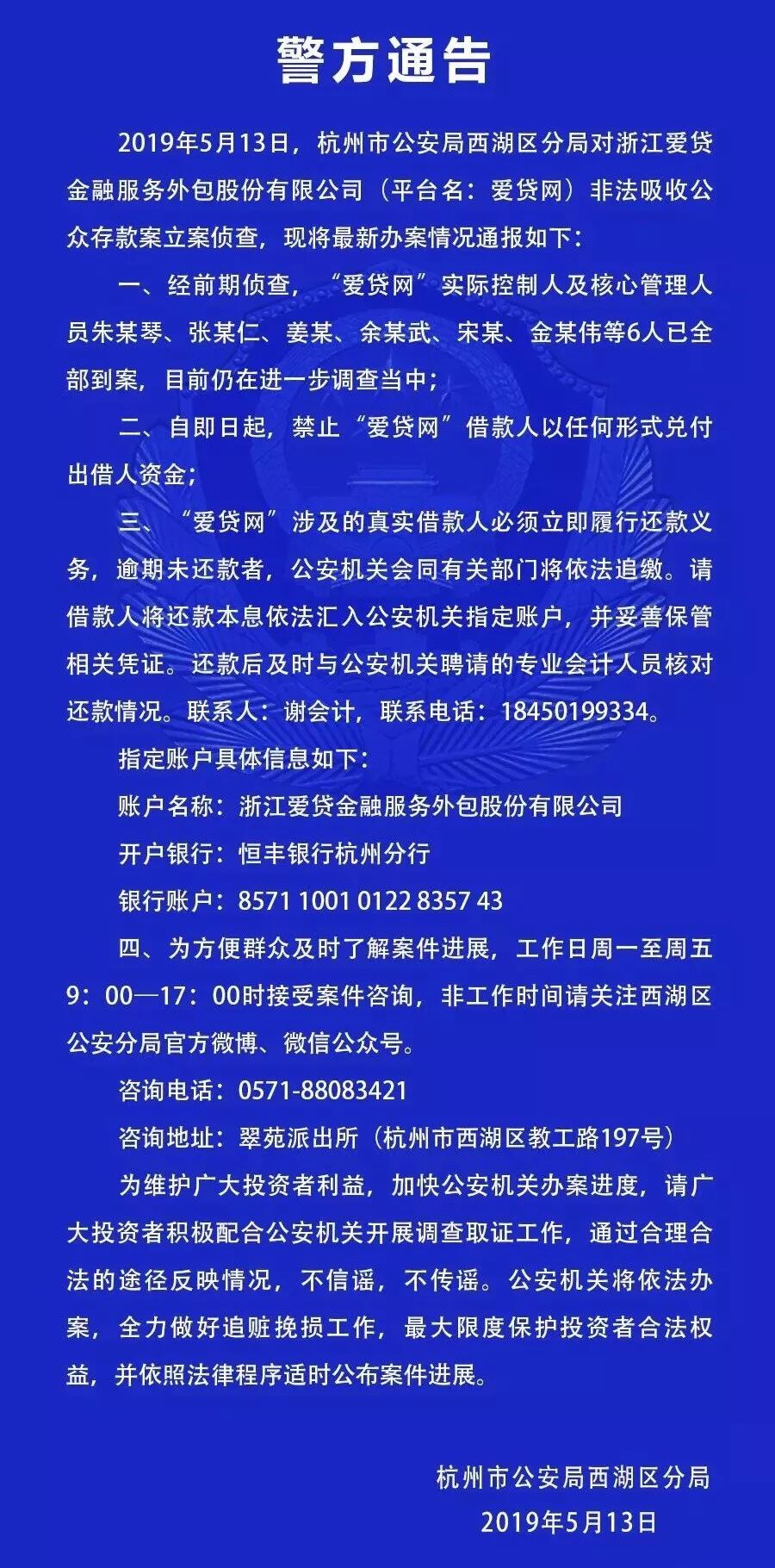 刚刚,杭州公安发布公告:对P2P平台爱贷网非法吸收公众存款案立案侦查,包括平台实控人朱某琴在内6人已被刑事拘留;同时,自即日起,禁止“爱贷网”借款人以任何形式兑付出借人资金。