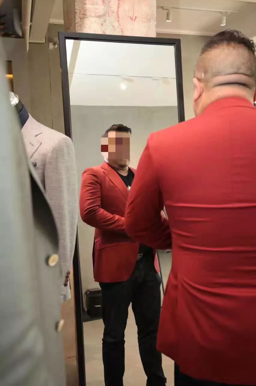 有匿名人士向新京报记者提供了两张孙小果的近照。一张身穿红色西服上衣,黑色西裤,正对镜试装。照片提供者称这是孙小果在一家西服定制店里拍摄的,拍照时间为2018年。