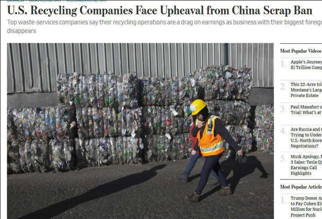 美国第二大固体废物处理公司——共和废品处理公司(Republic Services)副总裁库普兰(Richard Coupland)表示,他们公司已经在马来西亚、印度等地找到了新的买家,但美国直达那里的船只较少,这就增加了运输成本,再加上中国的相关政策导致废料市场供过于求,二手材料的全球价格大幅下跌,因此公司在海外的大部分销售都是亏钱的。