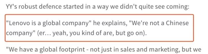 然后,联想公关立刻辩解,自己老板说的是:联想不仅仅是中国公司,更是一家全球公司。