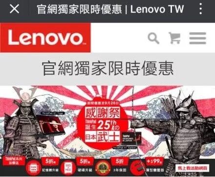 我不想扯太久远的事情(如果联想愿意,我会细细掰扯),就两年前,2017年9月18日这天,联想台湾站的促销广告是「感恩武士大疯杀」,怎么回事?