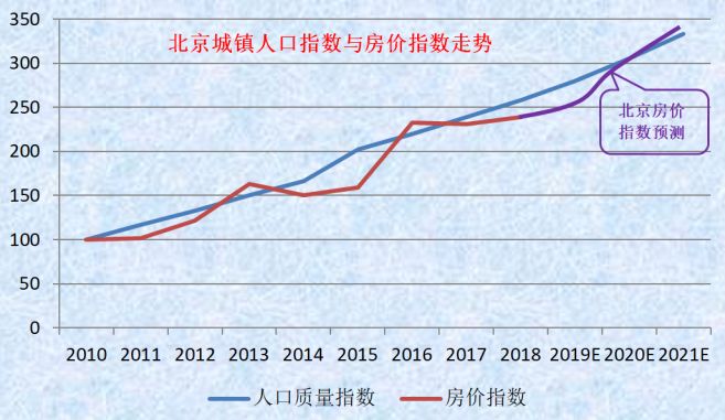 我们假定未来三年北京居民可支配收入年均增速为8.5%,据此推算出2021年年末北京城镇居民可支配收入达到86800元。在2021年时间节点上,将北京城镇居民可支配收入与城镇人口数量合成人口质量指数,再根据北京房价历史走势形态,假设在政策助攻的前提下,可以大致勾勒出一幅北京未来三年房价走行图。