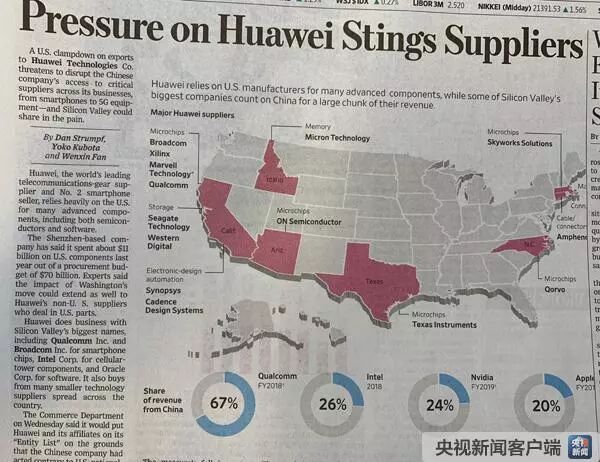 这样的“突变”,恰恰揭示出美国政府逆潮流而动的不得人心。《华尔街日报》刊发《施压华为,刺痛供应商》,文章说,美国政府出台政策限制向华为公司出口零部件和技术,美国硅谷也将因此受损,因为华为与硅谷的大公司都有生意往来,如从高通和博通购买芯片,从英特尔购买无线发射塔部件,从甲骨文购买软件,同时还从美国各地的小型技术公司采购,等等。文章还以一幅图示表明,从2018年的年报来看,这些公司相当一部分的收入来自中国。高通67%,英特尔26%,英伟达24%,苹果20%。