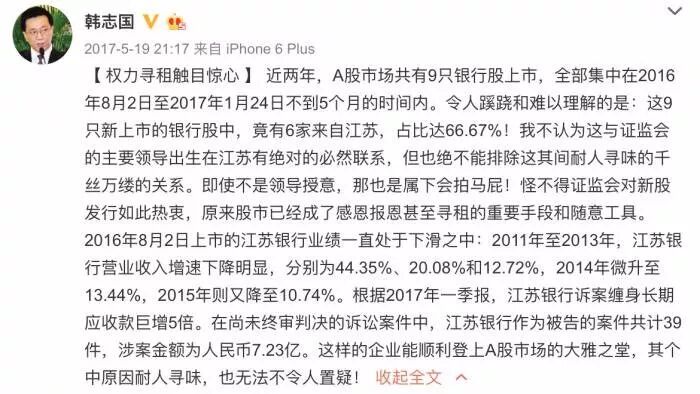 经济学家韩志国在2017年时就曾注意到了上述现象,他谈到,近两年,A股市场共有9只银行股上市,全部集中在2016年8月2日至2017年1月24日不到5个月的时间内。令人蹊跷和难以理解的是:这9只新上市的银行股中,竟有6家来自江苏,占比达66.67%!
