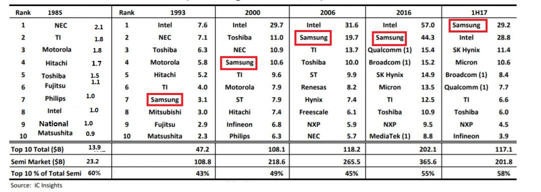 下面这幅图是1985年以来,全球十大半导体芯片制造商排名。红框标记出来的就是我们熟悉的:三星。