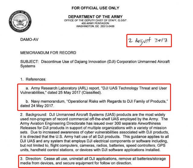 但是,2017年8月,美国陆军却高调发布禁令:一律停用所有中国企业大疆创新(DJI)生产的无人机及相关产品,理由是大疆的产品存在“网络安全漏洞”。