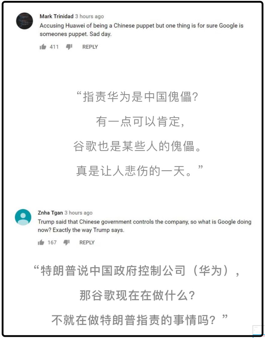 谷歌方面屈服于强权的这一决定,将直接导致华为智能设备无法使用Gmail(谷歌邮箱)、Chrome(谷歌浏览器)、Youtube(谷歌旗下西方最大视频网站)、Google map(谷歌地图)在内的所有谷歌主流产品。