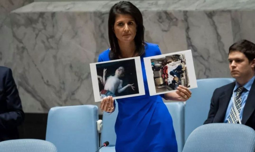 上图:拿造假信息在联合国大放厥词的美国驻联合国代表“黑莉”。