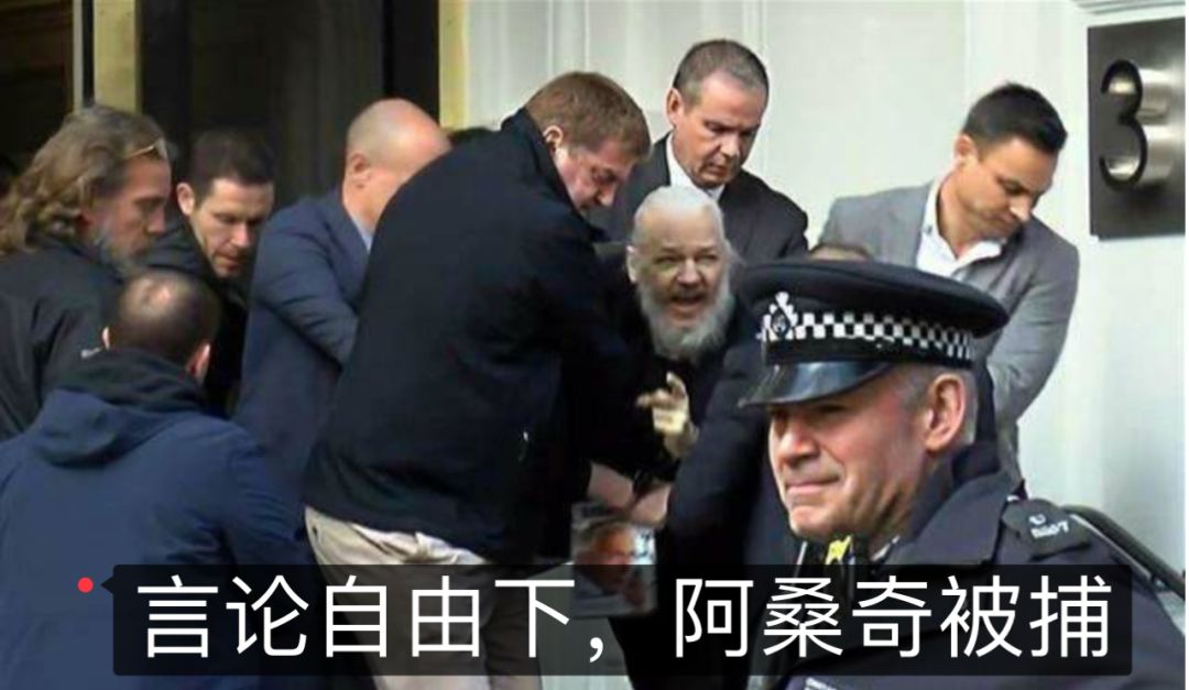 上图:因为公开了美国政府的丑陋行为,高举“言论自由”的美国,暴力拘捕维基解密创始人阿桑奇。