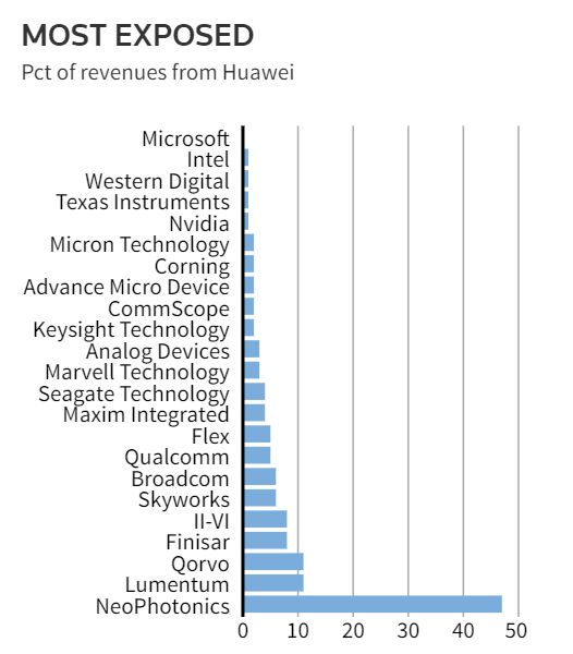2018年底,华为公布的92家核心供应商名单,其中美国有33家,占比最高。被美国列入“实体清单”当日,华为的美国供应商股票应声而跌,甚至有营收高度依赖华为的公司股价跌逾两成,元气大损。