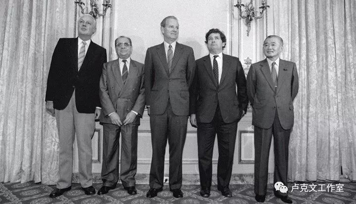 1985年9月22日,纽约广场大酒店,五国财政部长合影