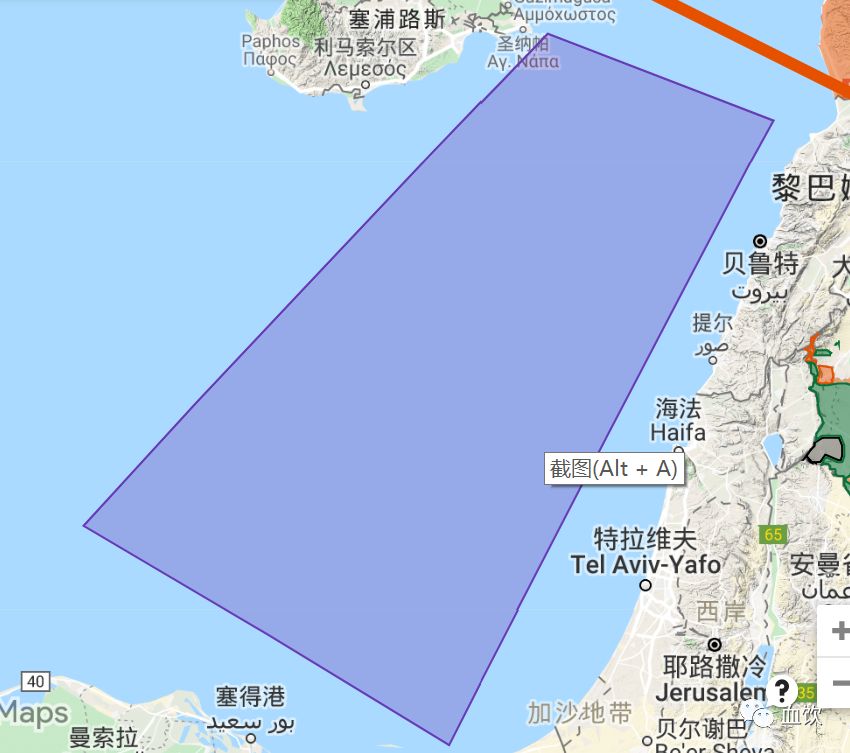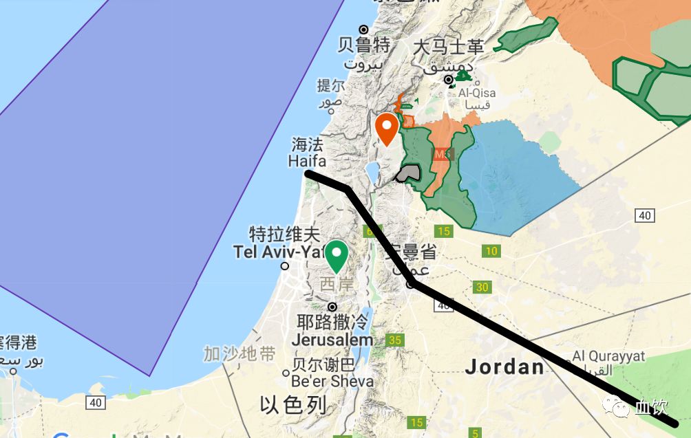 上图一为地中海东部天然气分布区,上图二是B管线从戈兰高地和约旦河西岸地区穿越。红点为戈兰高地,绿点为巴勒斯坦约旦河西岸。
