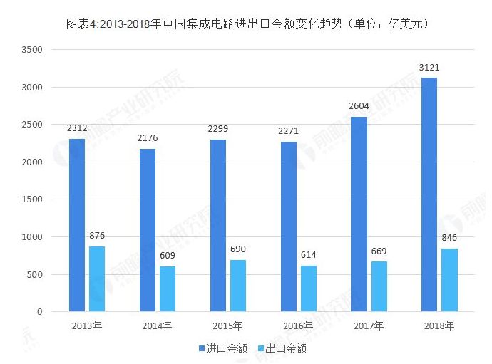 2018年全年,我国进口集成电路数量为4175.7亿个,同比增长10.8%,对应集成电路的进口额3120.58亿美元,同比增长19.8%。