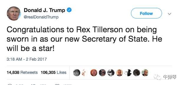 祝贺蒂勒森成为我们新的国务卿,他将成为一个明星!