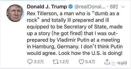 有仇报仇有怨报怨,特朗普哪受到了这样的“诽谤”。立刻上推特,痛骂蒂勒森“愚蠢得像块石头”。
