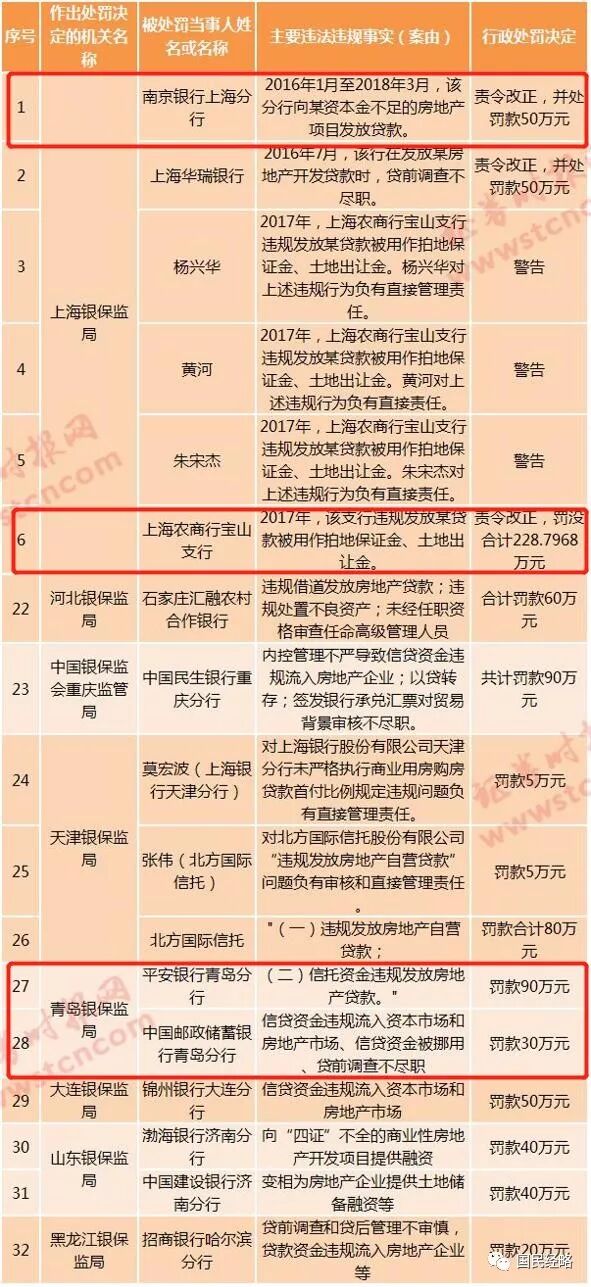 这些罚单涉及上海、天津、青岛、河北、重庆、大连、黑龙江等地15家金融机构。其中,最大的一笔是,上海农商行宝山支行因2017年违规发放某贷款被用作拍地保证金、土地出让金,被责令改正并罚没合计228.8万元。