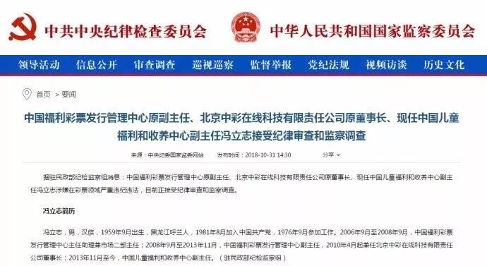 2018年10月,据民政部纪检监察组消息,中国福利彩票发行管理中心原副主任、北京中彩在线科技有限责任公司原董事长、现任中国儿童福利和收养中心副主任冯立志涉嫌在彩票领域严重违纪违法,目前正接受纪律审查和监察调查。