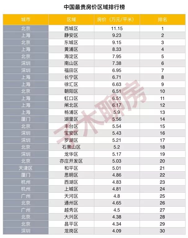 在30强中,我们除了一线城市外还看到了二线城市的身影,其中厦门的湖里区以5.56万元/平米排在第15位,其后是天津的和平区,杭州的西湖、上城区都以近5万元的房价排在其后。