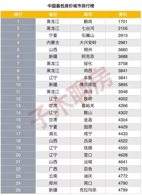 其中,黑龙江鹤岗房价以1701元/平米的均价位于全国倒数第一,其次是黑龙江的七台河,房价为2105元/平米。
