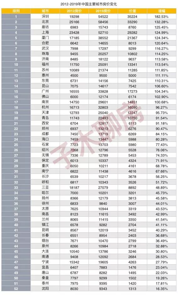从这份榜单中,我们可以看到,深圳以182.53%的涨幅位居中国第一,深圳这些年不仅创造了经济奇迹,也创造了房价的涨幅奇迹。这个涨幅意味着如果你2012年在深圳买一套100平米的房子,7年时间什么都不用做就可以净赚350多万,这还是在一般的地段上。