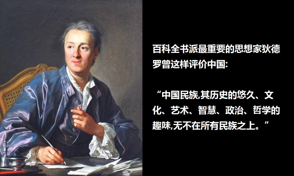 伏尔泰最崇拜孔子,原因是儒家思想完全不需要神的指引,照样建构出一套伦理规范和政治制度。狄德罗曾这样评价中国:“中国民族,其历史的悠久、文化、艺术、智慧、政治、哲学的趣味,无不在所有民族之上。”德国哲学家莱布尼兹在《中国近闻》中说:“我们从前谁也不信在这个世界上还有比我们的伦理更完善,立身处世之道更进步的民族存在。现在从东方的中国,竟使我们觉醒了。”